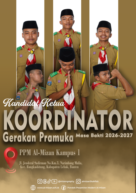 PPM. Al-Mizan, melalui Panitia Reformasi Pengurus (PRP) menyelenggarakan kegiatan Perkenalan Calon Ketua Organisasi Santri Pesantren Modern (OSPM) dan Koordinator Gerakan Pramuka Gugus Depan 01.135 PPM. Al-Mizan 1 Masa Bakti 2026/2027 pada Selasa,13 Januari 2025.