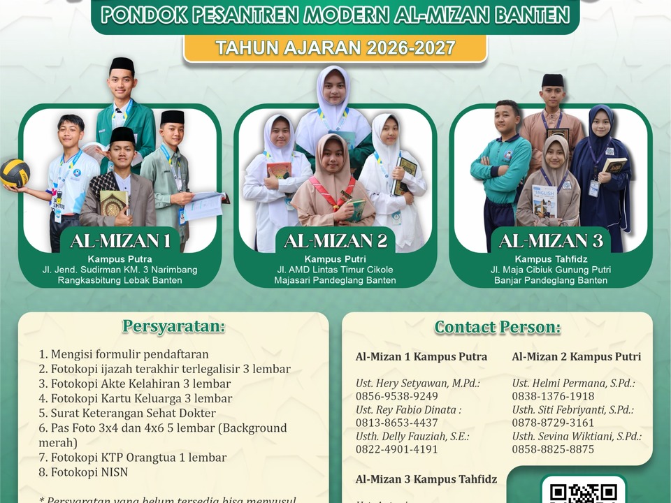 TELAH DIBUKA! PENDAFTARAN SANTRI BARU Pondok Pesantren Modern Al-Mizan Banten Tahun Ajaran 2026–2027 Bersama Al-Mizan, wujudkan generasi......Read more